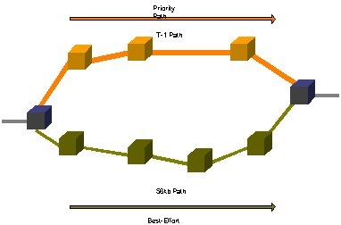Alternatively, the scenario could be a satellite path complemented by a faster terrestrial cable path. Best effort traffic would be passed along the higher delay satellite path, while priority traffic would be routed along the terrestrial cable system.
